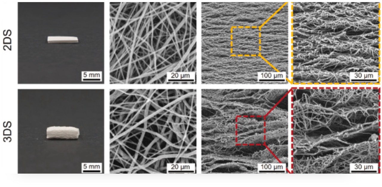 The difference in cell penetration into electrospun 2D scaffolds and electrospun 3D scaffolds were demonstrated by Chen et al (2024). Chen et al (2024) used gas foaming technique to open up the pores between the fibers without excessive application of force. With this, electrospun poly(L-lactide-co-ε-caprolactone) (PLCL)/silk fibroin (SF) nanofiber membrane was expanded to form a 3D scaffold. SEM images of the expanded membrane showed distinct but layered nanofibers with negligible changes in the nanofiber diameters. Inter-fiber gaps increase from 5.63 µm in the pre-foaming membrane to 49.81 µm in the expanded scaffold. Pore sizes also increased from 18.19 µm