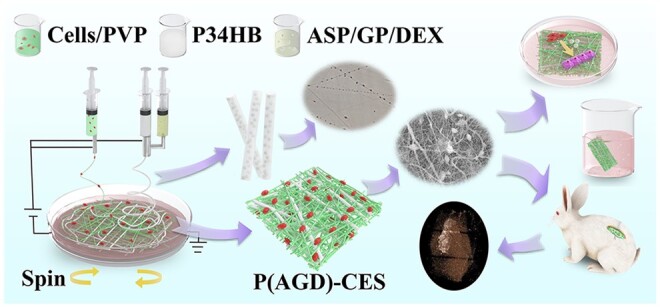 In a study by Lu et al (2023), scaffolds were prepared by co-electrospinning of human umbilical cord mesenchymal stem cells (HUCMSCs) and core-shell fibers (P(AGD)) with the shell made of poly(3-hydroxybutyrate-co-4-hydroxybutyrate) (P34HB) and the core loaded with aqueous solution containing osteogenic compounds L-ascorbic acid-2-phosphate magnesium (ASP), β-glycerophosphate sodium (GP) and dexamethasone (DEX) such that the cells were evenly distributed throughout the P(AGD) scaffold (P(AGD)-CES). In vivo study by subcutaneous implantation of P(AGD)-CES scaffold in rabbit was compared with scaffolds prepared with in vitro co-culturing of HUCMSCs on P(AGD), P34HB nanofiber scaffold but in osteogenic media (P-(ADG)) and P34HB, for 2 weeks prior to implantation. After 8 weeks, the P(AGD)-CES in rabbits showed significant new bone formation and better results compared to the other scaffolds where HUCMSCs were cultured on the scaffolds prior to implantation. The better performance of P(AGD)-CES may be attributed to better distribution of cells throughout the depth of the scaffold compared to the others where the cells were mainly found on the surface.