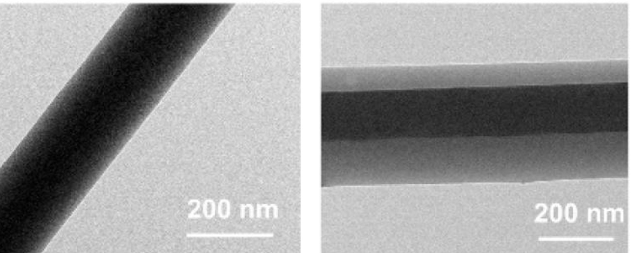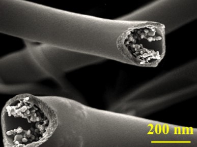Zeng et al (2021) constructed a core-shell silicon (Si) and carbon (C) fiber using electrospinning for lithium-ion batteries application. Using a coaxial nozzle, a dispersion of Si nanoparticles in poly(methyl methacrylate) (PMMA) solution was injected through the core and the outer solution was a polyvinylpyrrolidone (PVP) solution. Heat treatment followed by carbonization at 800 °C was carried on the electrospun core-shell fibers to convert the PVP into carbon. The resultant Si@C fibers showed a smooth outer carbon layer with evenly dispersed Si nanoparticles at the core. This Si@C core-shell fiber membrane was shown to exhibit much better charge capacity compared to a Si/C blended fiber membrane.