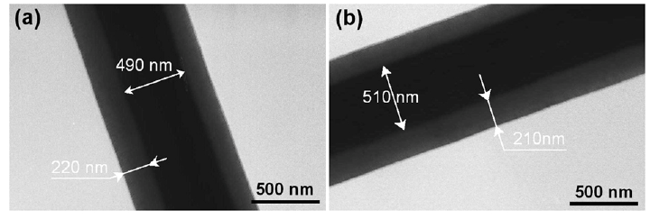 Coaxial electrospinning has also been used successfully to construct single polymer composite where the core and shell material are chemically similar. Kriel et al (2012) fabricated such composite with poly(L-lactide) as the core material and poly(DL-lactide) as the shell. Conventional method of viewing the core-shell profile using transmission electron microscope (TEM) is not possible due to poor or no contrast between the two materials. Indirect method involving removal of one of the component may be necessary to verify the core-shell arrangement.