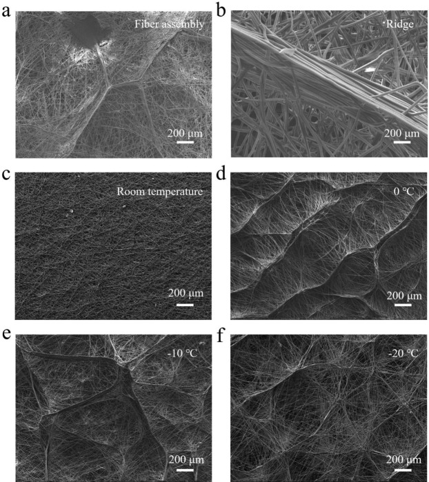 A more extreme method of producing electrospun fibers with honeycomb arrangement is to reduce the surface temperature of the collector to below freezing point of water. Tian et al (2023) used a copper collector cooled to -20 °C to induce the formation of ridge-like structure by the electrospun polycaprolactone (PCL) fibers. At room temperature, the electrospun PCL membrane is smooth without any particular structural arrangement. When the temperature was reduced to zero °C, wall-like structure started to form but it is only when the temperature was reduced to -20 °C that ridge-like arrangements were formed throughout the membrane with wider spacings between the fibers. With this setup, the resultant membrane has a smooth underside which was in contact with the collector and a rough surface with the ridge-like structures. It was suggested that with the reduced temperature of the electrospinning environment, solvent vaporization was reduced and the electrical charges carried by the residual solvent encouraged the self-organization of the electrospun fibers.