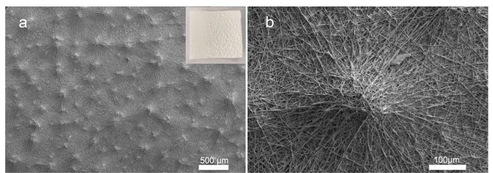 Yao et al (2019) conducted a more detailed study to demonstrate the effect of electrospinning condition on the formation of honeycomb structures by polycaprolactone (PCL) fibers. In general agreement with the effect of electric field on honeycomb formation, the honeycomb size varies according to the distance between the needle tip and the collector and the distance of the honeycombs from the center of the collector. At distance further from the needle tip, the electric field weakens and the size of the honeycombs formed by the electrospun fibers become smaller. With a fixed distance between the electrospinning needle tip and collector, honeycomb structures directly below the needle is larger than those further away. Larger distance between the needle tip and collector also led to smaller honeycomb structures. The duration of fiber deposition does not affect the organisation of the honeycomb structure.