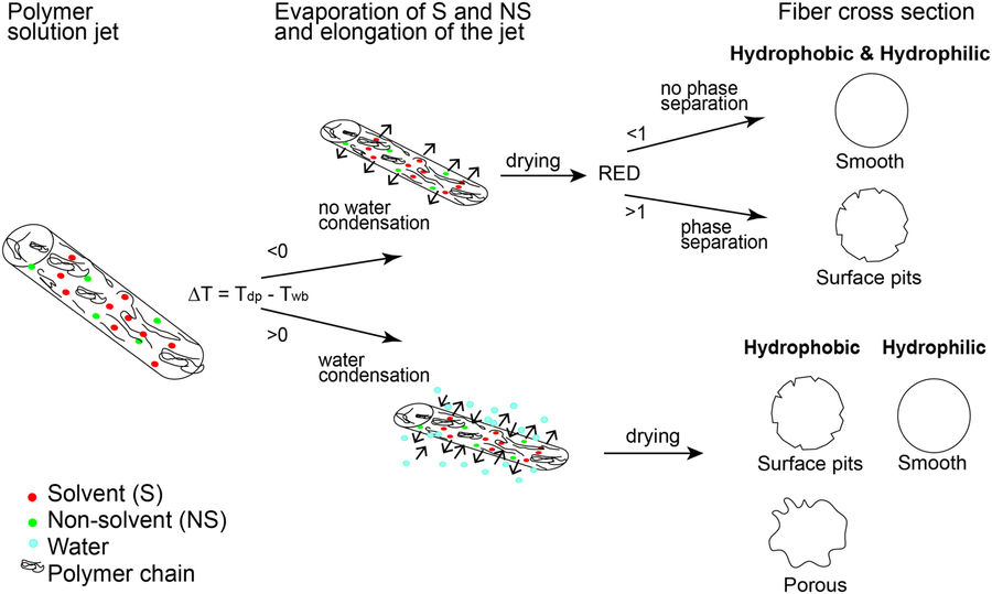 To generate porous fibers in a high humidity environment, there are two additional factors that need to be in place. A material that is non-water soluble is needed to respond to water condensation on the electrospinning jet and a volatile solvent to lock-in the feature. If the solvent evaporation is too slow, the formed feature would re-dissolve into the solution and a smooth fiber would form instead [ Nezarati et al 2013]. Regardless of whether the pore formation is due to breath figures or phase separation, these three factors need to be optimized to obtain or eliminate porous fibers. Yazgan et al (2017) conducted a series of tests on the influence of humidity, polymer solubility and water condensation due to temperature of polymer solution surface during electrospinning to come out with a working hypothesis to predict the formation of pits and surface structures on electrospun fibers. In more volatile solvent, evaporation rate will be faster and this will favor rapid cooling of the fiber surface to a minimum temperature known as wet bulb temperature (Twb). When the surrounding air is cooled to full saturation, it reaches the dew point (Tdp) and water condenses on the surface. In agreement with other published reports, higher humidity tends to favor pits and grooves on fiber surface for hydrophobic polymers as demonstrated by PCL and PLLA while hydrophilic polymers give smooth surface fiber as demonstrated by PVP. This is due to Twb on the surface surface dropping below Tdp which causes water droplets to form pits on it, also known as breath figures. However, there are also cases where wrinkled fiber surface are formed without temperature dropping below Tdp. Phase separation due to solubility of the polymer in the solvent would account for it. Solubility may be determined by RED value which is ratio of the coordinates' distance to the center of the sphere and the sphere's interaction radius of the molecule. RED value lower than 1 signifies higher solubility. Essentially, when RED is greater than 1, phase separation is more likely to occur resulting in wrinkled fiber surface. It is also important to note that with water condensing or absorption into the solvent during electrospinning, the RED value may increase thereby inducing phase separation.