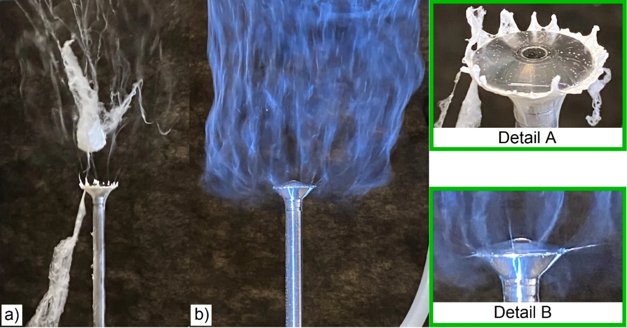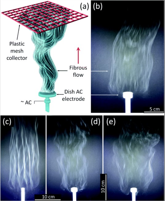 (a) AFES experiment schematics and photos of the flows of precursor fibers with x1.5 TiO2/polymer yield mass ratio generated (mass of TiO2 generated per unit mass of polymer carrier) on (b) 25 mm and (c) 12.5 mm diameter electrode at 29.5 kV rms AC voltage; and with (d) x0.5 and (e) x2.5 TiO2/Polymer yield mass ratio generated using 25 mm diameter electrode at the same AC voltage [Nealy et al 2020].