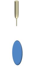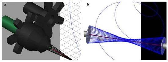 AutoCAD images of (a) the final design of the modified air-gap electrospinning with motor setup, signifying the stationary (green) and rotating (black) parts. (b) A simplified setup demonstrating the wrapping of electrospun fibers (blue) around the glass fiber (red) [Linder et al 2020]