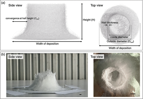 (a) Diagrams and (b) examples of parameters used to illustrate 3D electrospun structures in this work. The scale bar is 10 mm [Chinnakorn et al 2024].
