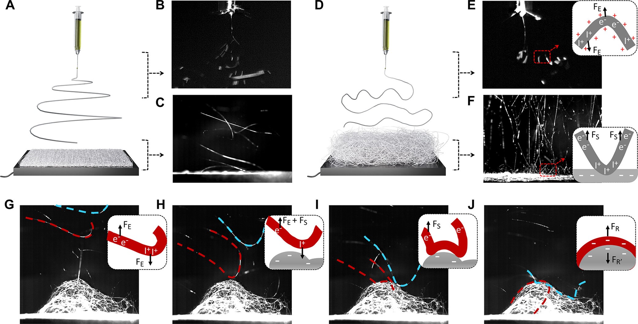 In situ observation of solution jet behavior and fiber assembling process. (A,D) Schematic illustrations of the 2D and 3D electrospinning processes, respectively. High-speed camera images taken near the nozzle (B,E) and at the substrate region (C,F) show the different behaviors of solution jets and solidified fibers. Inset in (E) schematically explains the formation of vertical spirals of the solution jet. The jet segment carries unevenly distributed charges. + represents the excessive charge from the high voltage. I+ (or e-) refers to positive (or negative) ions which redistribute inside the partially solidified fiber in response to the electric field. Such ions are subjected to an electrostatic force (FE) along (or opposite) the direction of electric field. Inset in (F) suggests that the top of the fiber assemblies is polarized by induced negative surface charges (white ?), thus exerting repulsive force (FS) on the negative ions inside fiber to reorientate the fiber upon landing. (G-J) In situ observation of fiber assembling process on the substrate. Two individual fibers are traced and labeled in red and blue, respectively. Schematics highlight the forces acting on red fiber, i.e., the electrostatic forces from the electric field (FE), the polarized fiber surface (FS), and the Columbic repulsions (FR), among nearby fibers once the fiber lands and undergoes polarization [Dong et al 2023]..