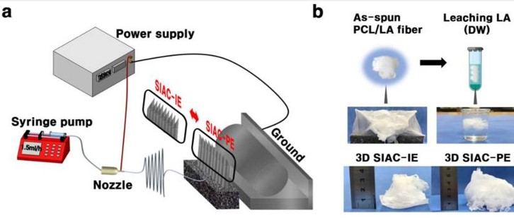 (a) Schematic illustration of electrospinning set up. (b) LA leaching process of PCL/LA fibers [Cho et al 2019] .