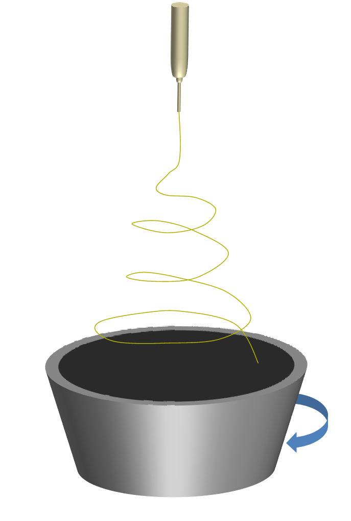 Fig 5. A variant of centrifugal electrospinning setup where a porous rotating bowl or cup is used to collect aligned fibers.