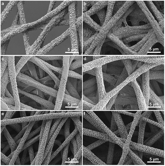 Varying the feedrate of inorganic precursor and polymer solution has been shown to affect the fiber morphology of the sintered nanofiber. Lower feedrate for electrospinning tin(IV) acetate and polyvinyl acetate results in smooth surface and solid fibers while increasing feedrate leads to porous and thin walled SnO2 assemblies after sintering. Following incorporation of Pt on both fiber assemblies, the porous and thin walled SnO2 assembly showed five-fold higher acetone responses than the solid smooth surface fibers. The reason for this difference in morphology has been attributed to greater absolute volume of solvent at high feedrate which subsequently induces greater phase separation and thus giving rise to the thin-walled and porous structure [Shin et al 2012]. Controlling the processing environment and solution composition is the most common method for introducing pores on electrospun fiber surface. However, this limits the type of solution that can be used to produce porous fibers.
