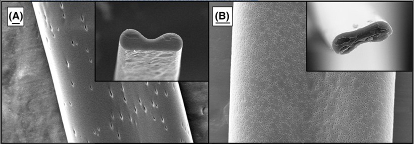 In composite, surface topography of the filler fibers may also affect the interfacial compatibility with the matrix material. Xuan et al (2021) tested the effect of electrospun poly (L-polylactic acid) (PLLA) fibers with smooth and porous surface topography when embedded within a poly(methyl methacrylate) (PMMA) matrix. Comparing the light transmittance of the composite, pure PMMA has the highest transparency of 89% at wavelength of 589 nm. For PMMA composite containing smooth surface PLLA fibers, the transmittance drops to 80.16%. With porous fibers, the drop in transmittance was less and the composite containing the fibers with larger pores has a transparency of 88.72%. This is despite smooth surface fibers having the smallest diameter. The better light transmittance may be due to greater interfacial compatibility between the porous PLLA fibers and the PMMA matrix.