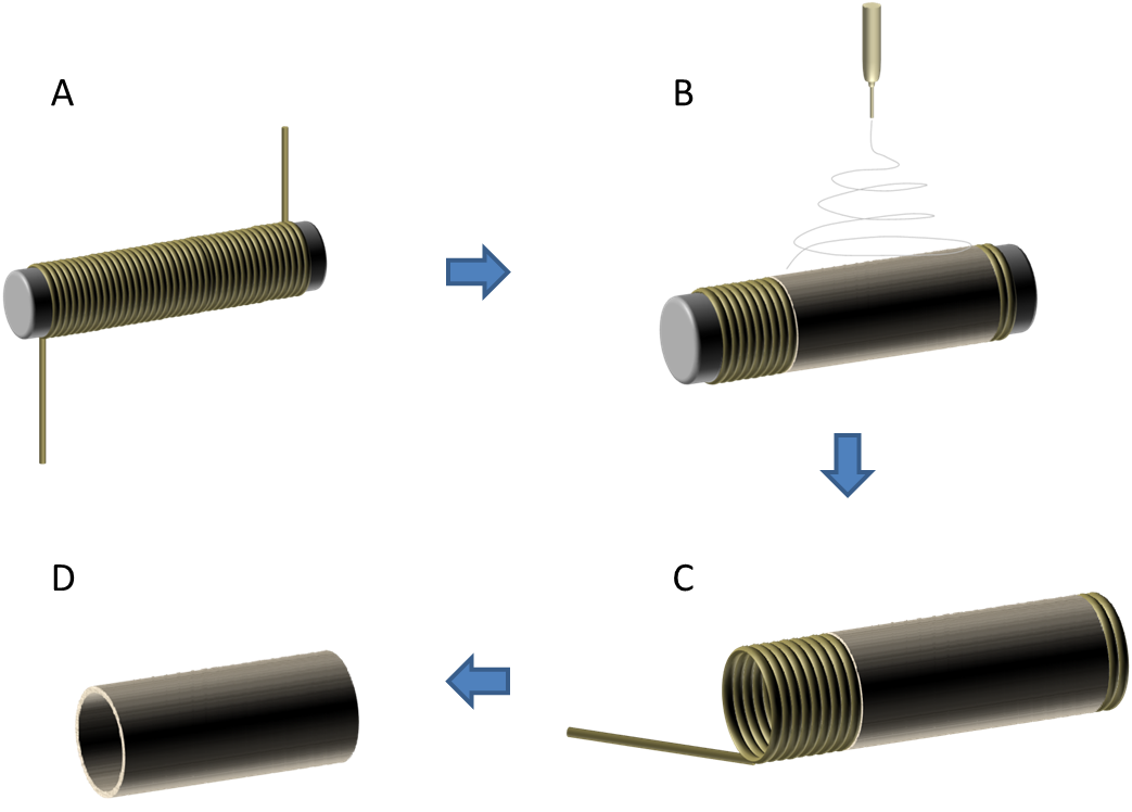 In a technique developed by Errico et al [2011], a mechanical means of creating a removal barrier between the deposited fibers and the rod is to have a wire coiled around the rod prior to fiber deposition. After the fibrous tube is formed on the coiled wire, the inner rod may slide out from the coiled wire. The coiled wire now freed from the supporting rod can be removed from the inner wall of the fibrous tube. See figure 3 for a schematic illustration of the method.