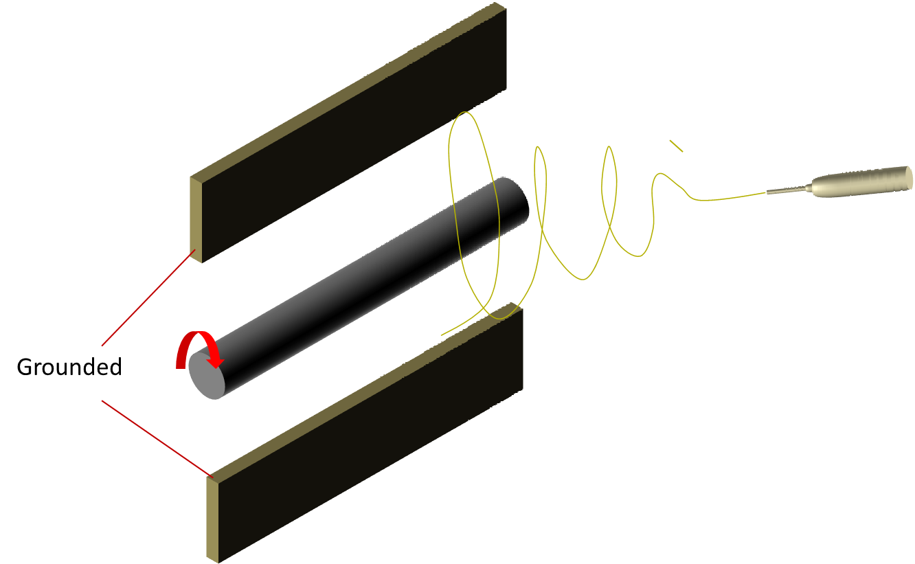 For a simple lab-based setup, a motor with an adjustable vice chuck is most appropriate as this allows rods of various diameters to be used and to ensure that the center of rotation of the rod is along its longitudinal axis. An earthed wire may be used to touch the rotating metal rod for better grounding.